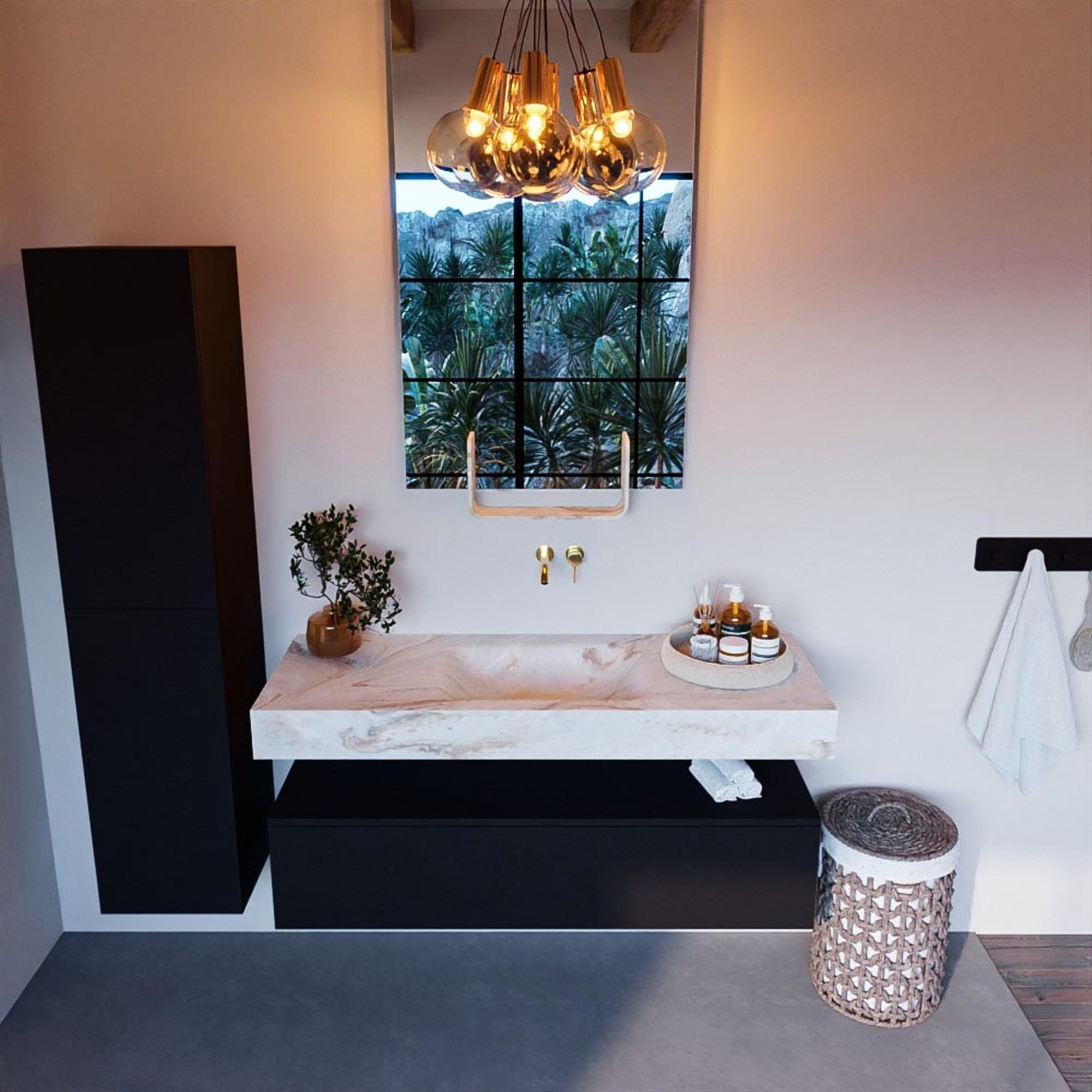 Dit badkamermeubelset van 130cm breedte is niet alleen een esthetische toevoeging, maar ook zeer functioneel. De lade zorgt voor georganiseerde opslag van badkamerbenodigdheden en de vrijhangende wastafel biedt voldoende ruimte om comfortabel te kunnen gebruiken. Met 0 kraangaten heeft dit meubel een minimalistische uitstraling die perfect past bij een eigentijdse badkamer.
