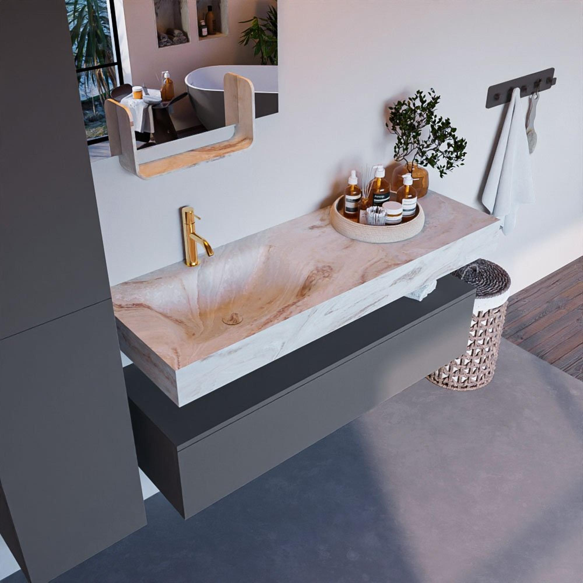 Creëer een fantastische elegante uitstraling in uw badkamer met de badkamermeubel set Alan DLUX. De schitterende badmeubel set ALAN-DLUX bestaat uit een vrij hangende wastafel met zachte organische lijnen van CORIAN in gemarmerd Solid Surface gecombineerd met de ALAN badmeubel. De badkamermeubel set ALAN-DLUX is geschikt voor iedere badkamer of deze nu klein of groot is. Om uw badkamer helemaal compleet te maken zijn ook diverse accessoires in deze marmers verkrijgbaar.