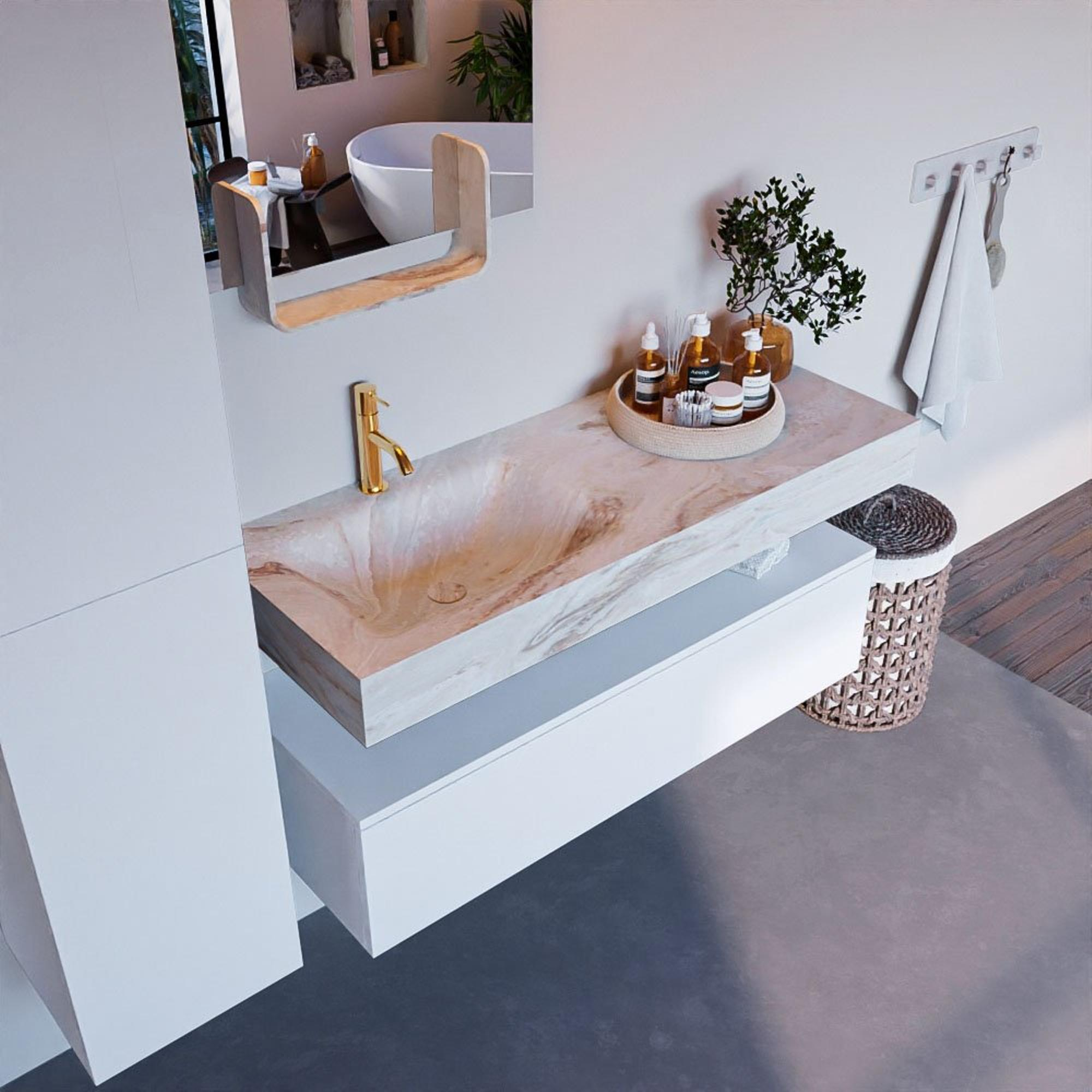 Creëer een fantastische elegante uitstraling in uw badkamer met de badkamermeubel set Alan DLUX. De schitterende badmeubel set ALAN-DLUX bestaat uit een vrij hangende wastafel met zachte organische lijnen van CORIAN in gemarmerd Solid Surface gecombineerd met de ALAN badmeubel. De badkamermeubel set ALAN-DLUX is geschikt voor iedere badkamer of deze nu klein of groot is. Om uw badkamer helemaal compleet te maken zijn ook diverse accessoires in deze marmers verkrijgbaar.