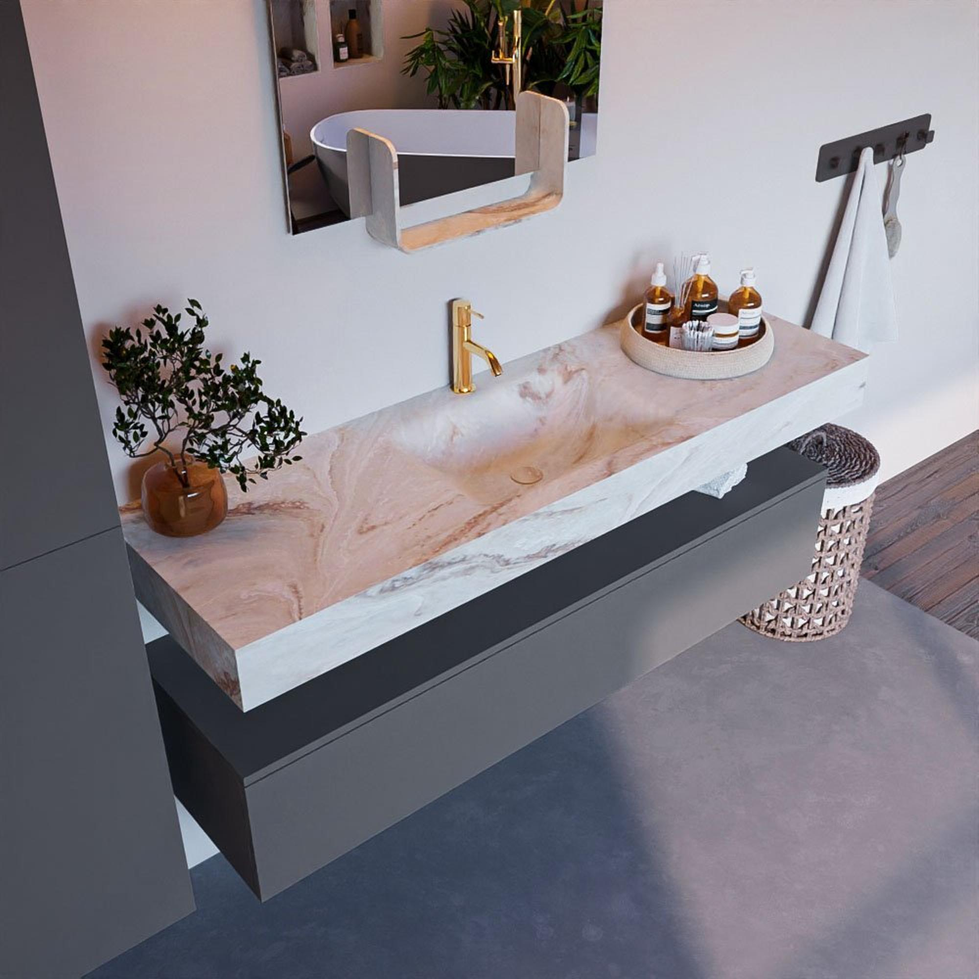 Creëer een fantastische elegante uitstraling in uw badkamer met de badkamermeubel set Alan DLUX. De schitterende badmeubel set ALAN-DLUX bestaat uit een vrij hangende wastafel met zachte organische lijnen van CORIAN in gemarmerd Solid Surface gecombineerd met de ALAN badmeubel. De badkamermeubel set ALAN-DLUX is geschikt voor iedere badkamer of deze nu klein of groot is. Om uw badkamer helemaal compleet te maken zijn ook diverse accessoires in deze marmers verkrijgbaar.