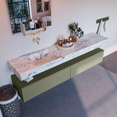 MONDIAZ ALAN - DLUX Badkamermeubelset - 200cm - onderkast - Army - 2 lades - vrijhangende wastafel - wasbak links - 0 kraangaten - Glace
