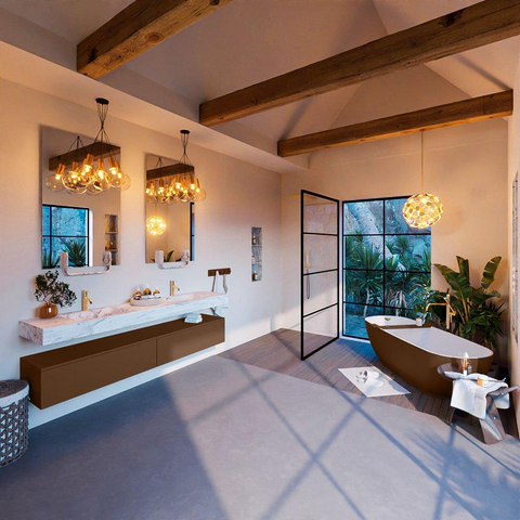 Ontdek de pracht van de MONDIAZ ALAN - DLUX Badkamermeubelset - een ware aanwinst voor elke badkamer. Met zijn elegante design en hoogwaardige afwerking brengt dit badkamermeubelset een vleugje luxe in jouw dagelijkse routine. Het 200cm lange meubelstuk in de warme Rust kleur is voorzien van 2 lades, een vrijhangende wastafel met 2 wasbakken en 2 kraangaten, waardoor functionaliteit en stijl perfect samenkomen.