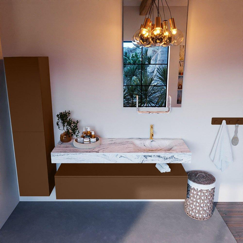 Naast zijn esthetische waarde is dit badkamermeubelset ook zeer functioneel. De 1 lade biedt handige opbergruimte voor handdoeken, toiletartikelen en andere benodigdheden. De vrijhangende wastafel met de wasbak rechts zorgt voor een ergonomische indeling en maakt efficiënt gebruik van de beschikbare ruimte. Dit meubelstuk combineert stijl met praktisch gebruiksgemak.