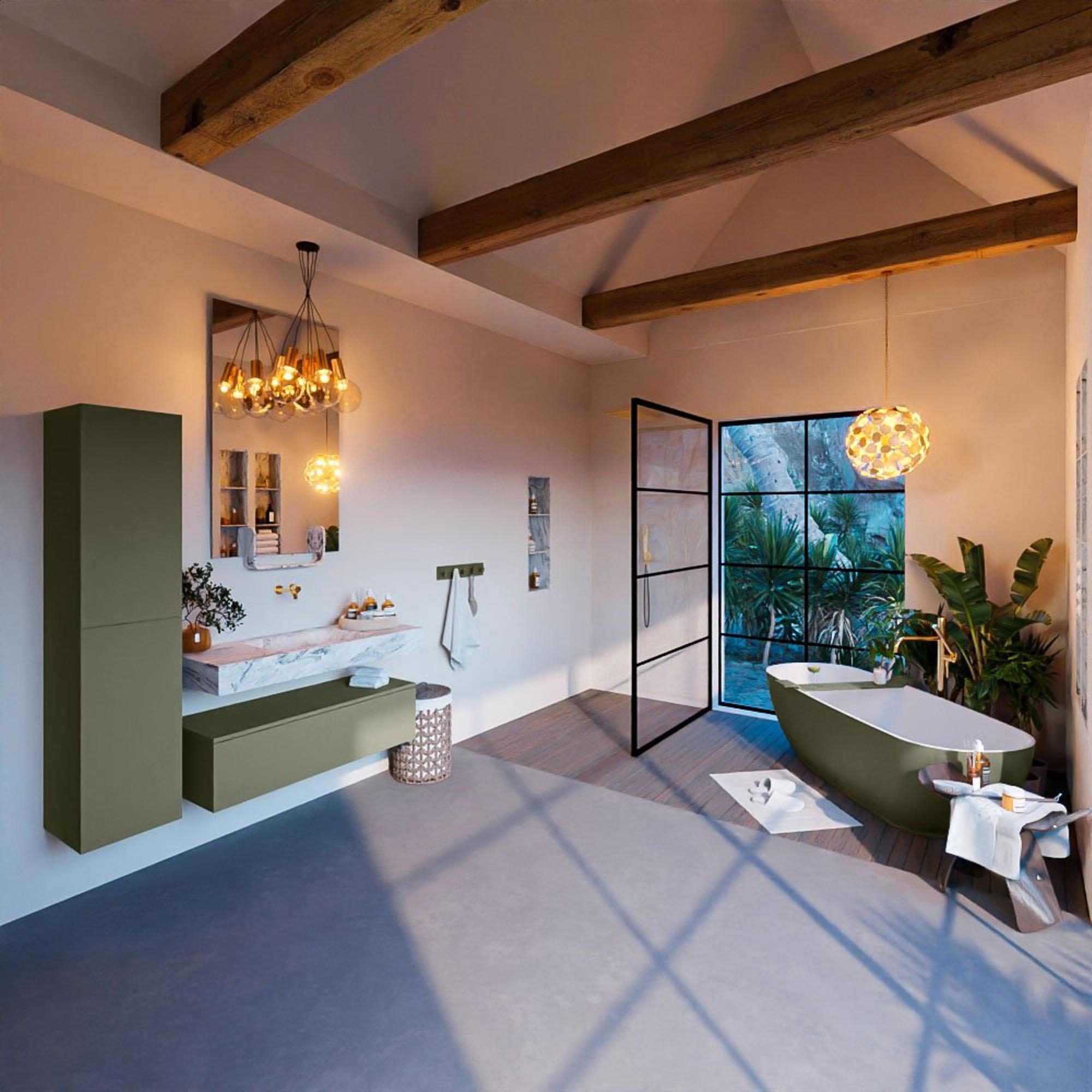 De MONDIAZ ALAN - DLUX Badkamermeubelset onderscheidt zich door zijn stijlvolle ontwerp en verfijnde afwerking. De combinatie van de Army kleur en glace afwerking zorgt voor een eigentijdse uitstraling die moeiteloos past in verschillende badkamerstijlen. De vrijhangende wastafel en de centraal geplaatste wasbak creëren een symmetrisch en harmonieus geheel, waardoor jouw badkamer een luxe uitstraling krijgt.