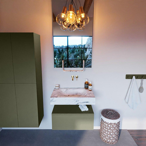 De MONDIAZ ALAN - DLUX Badkamermeubelset is een elegante toevoeging aan elke badkamer. Met zijn stijlvolle ontwerp en hoogwaardige afwerking brengt dit meubel een vleugje luxe in jouw badkamer. De onderkast in de kleur Army met 1 lade biedt niet alleen voldoende opbergruimte, maar zorgt ook voor een opgeruimde uitstraling. De vrijhangende wastafel met de wasbak in het midden geeft een moderne touch aan de set. Bovendien zijn er 0 kraangaten, waardoor je zelf de vrijheid hebt om de kraan naar keuze toe te voegen. De Glace afwerking geeft het geheel een verfijnde uitstraling.