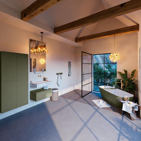 De MONDIAZ ALAN - DLUX Badkamermeubelset straalt moderniteit uit in elke badkamer. Met strakke lijnen en een minimalistisch ontwerp past dit meubel perfect in eigentijdse interieurs. De combinatie van de vrijhangende wastafel en de middengeplaatste wasbak zorgt voor een symmetrisch en evenwichtig uiterlijk. De Army kleur voegt een vleugje elegantie toe, terwijl de Glace afwerking een subtiele glans geeft die de moderne uitstraling versterkt.
