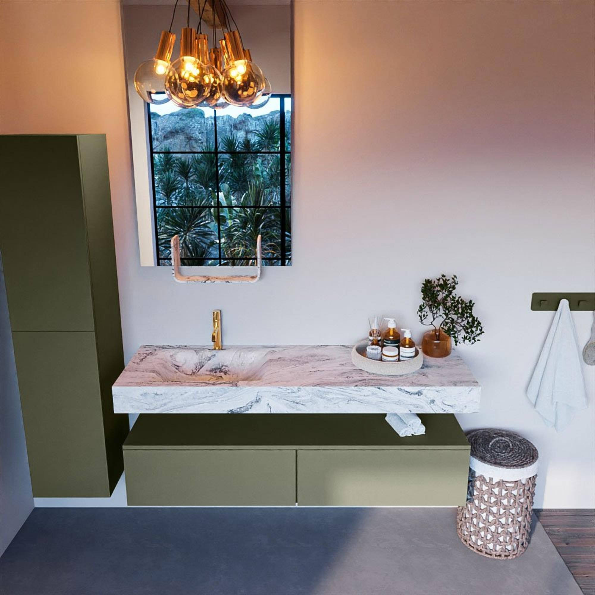 Dit badkamermeubelset straalt stijl en klasse uit. De Army kleur geeft een modern en trendy tintje aan je badkamer. De vrijhangende wastafel zorgt voor een ruimtelijk gevoel en de lades bieden niet alleen opbergruimte, maar dragen ook bij aan de strakke uitstraling van het geheel. Met dit meubelstuk creëer je een eigentijdse en chique sfeer in je badkamer.