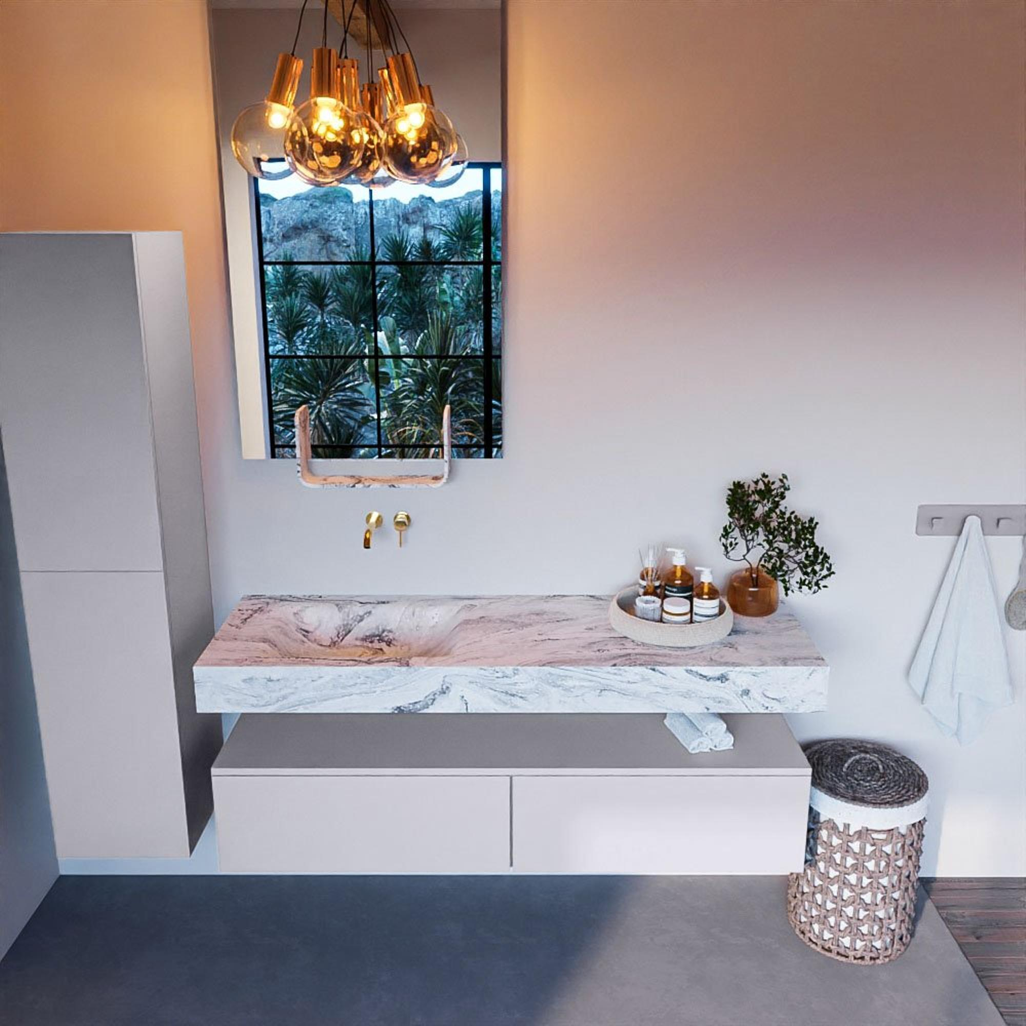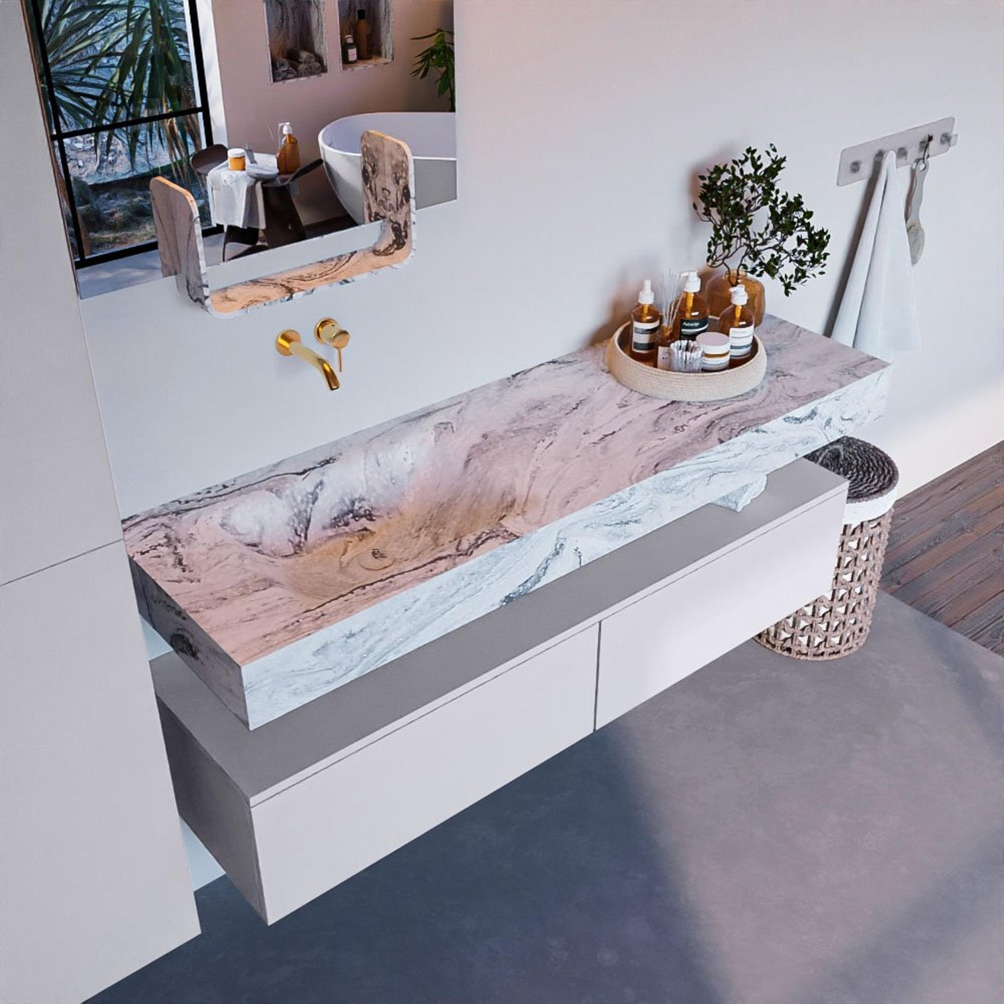 Dit badkamermeubel is niet alleen mooi, maar ook uiterst functioneel. De 2 lades bieden voldoende ruimte om al je badkamerspullen georganiseerd op te bergen. De vrijhangende wastafel zorgt voor een ruimtelijk gevoel in de badkamer en maakt het schoonmaken eenvoudig. Met de wasbak aan de linkerkant en 0 kraangaten is dit meubel perfect afgestemd op jouw behoeften.