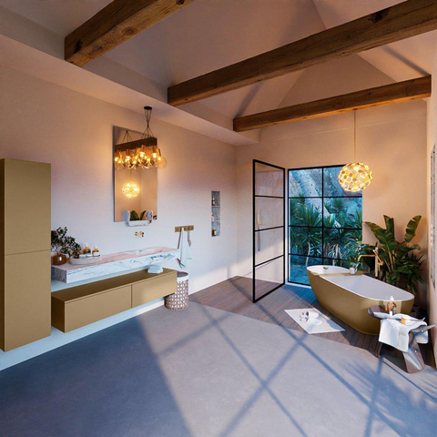 De MONDIAZ ALAN - DLUX badkamermeubelset straalt elegantie uit met zijn strakke lijnen, glanzende Glace afwerking en subtiele details. Het ontwerp is tijdloos en past perfect bij zowel moderne als klassieke badkamers. De onderkast in de warme Oro kleur voegt een vleugje luxe toe, terwijl de vrijhangende wastafel een gevoel van ruimte en lichtheid creëert.