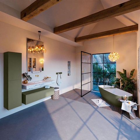 De MONDIAZ ALAN - DLUX badkamermeubelset valt op door zijn stijlvolle ontwerp en luxueuze uitstraling. Het diepe Army kleurenschema geeft een gevoel van warmte en elegantie aan de badkamer. De vrijhangende wastafel en de Glace afwerking voegen een vleugje moderniteit toe, waardoor dit meubelstuk een blikvanger wordt in elke badkamer.