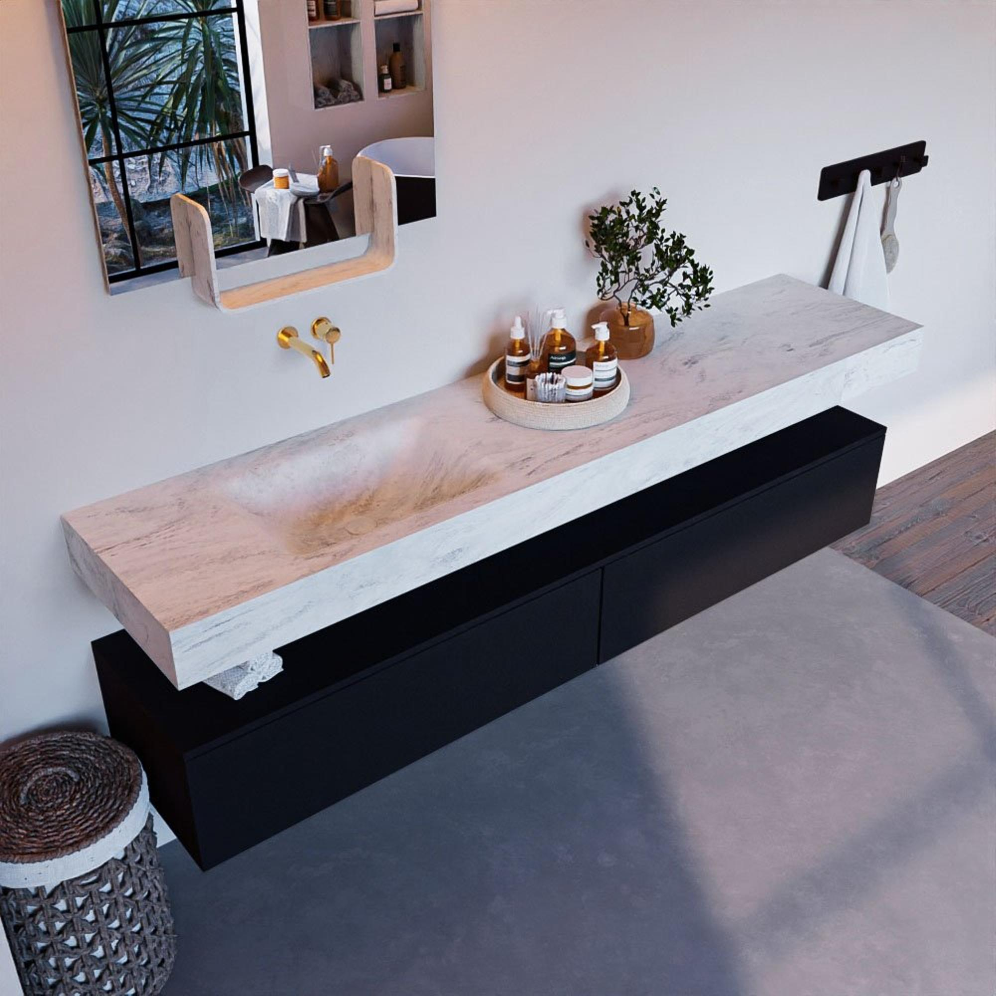 Niet alleen is dit badkamermeubelset mooi om naar te kijken, maar het is ook uiterst functioneel. Met twee ruime lades biedt het voldoende opbergruimte voor al je badkamerspullen. De vrijhangende wastafel zorgt voor een gemakkelijke reiniging van de vloer en geeft de badkamer een ruimtelijk gevoel. De 0 kraangaten geven je de vrijheid om de kraan naar wens te plaatsen.