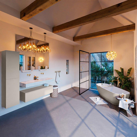 Deze badkamermeubelset straalt luxe uit met zijn elegante design en hoogwaardige afwerking. De Linen kleur geeft een warme en stijlvolle uitstraling aan de ruimte, terwijl de vrijhangende wastafel met twee wasbakken zorgen voor ultiem comfort en functionaliteit. De 1 lade biedt voldoende opbergruimte voor al je badkamerbenodigdheden, waardoor alles netjes georganiseerd blijft.