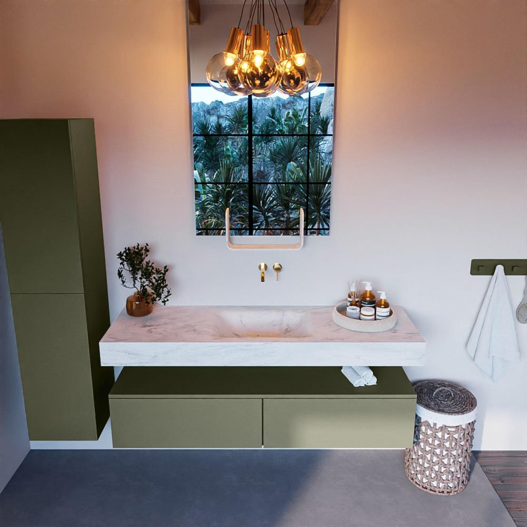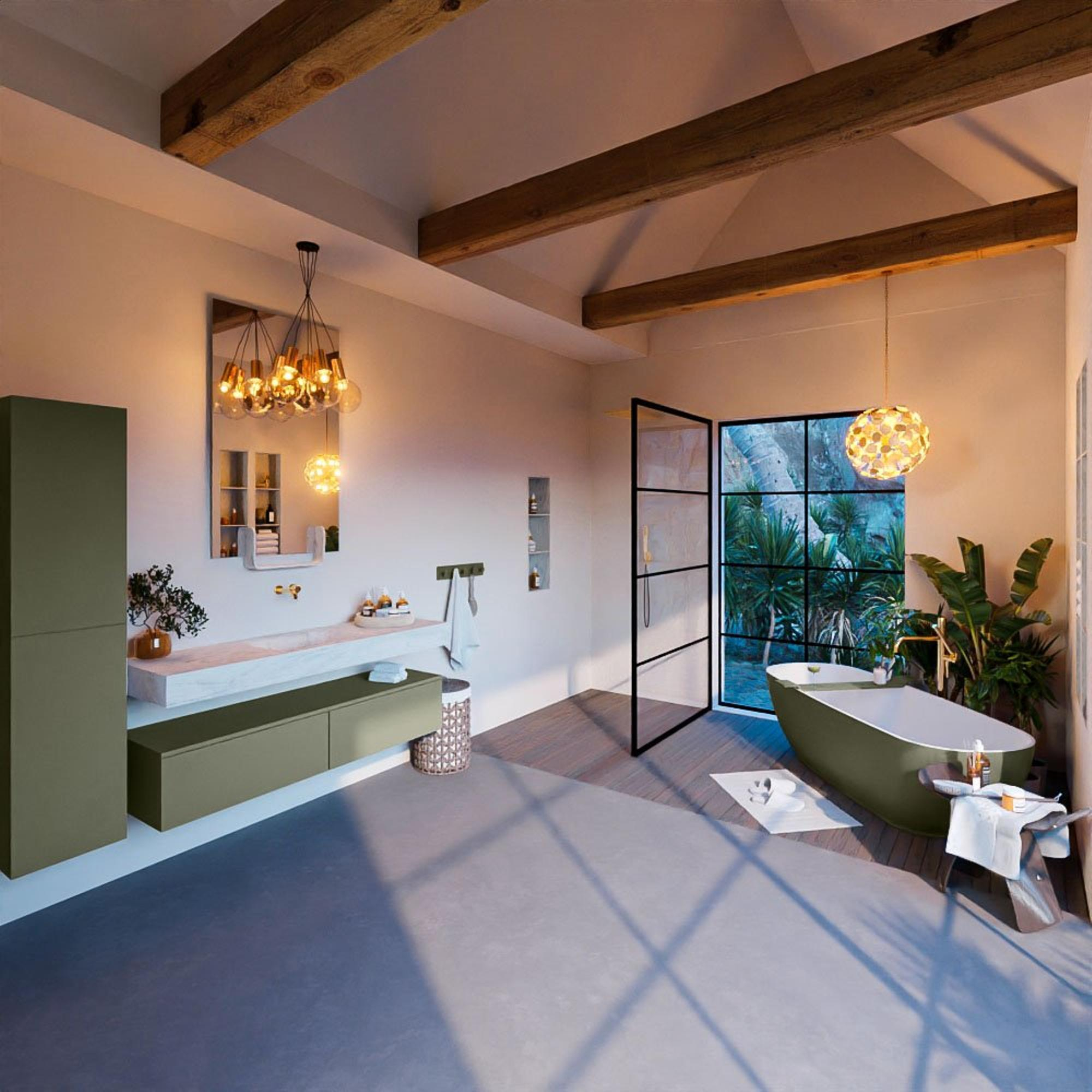 Dit badkamermeubelset straalt luxe uit in elk detail. De hoogwaardige materialen en afwerking zorgen voor een exclusieve uitstraling. De vrijhangende wastafel en de middengeplaatste wasbak creëren een gevoel van ruimte en elegantie. De Army kleur voegt een vleugje warmte toe aan de badkamer, terwijl de 2 lades voldoende opbergruimte bieden voor al je badkamerbenodigdheden.