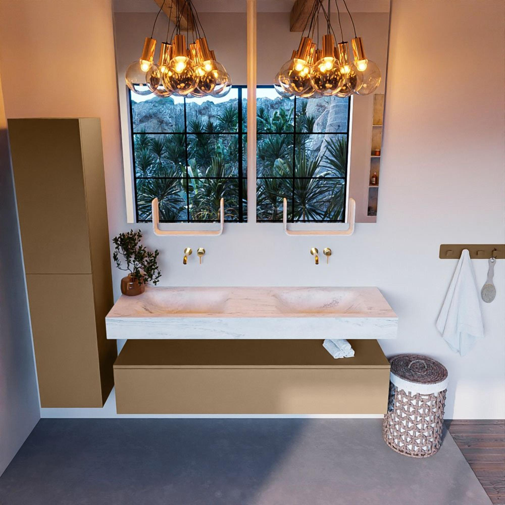 De MONDIAZ ALAN - DLUX badkamermeubelset is prachtig vormgegeven met aandacht voor detail. De Oro afwerking geeft een warme en luxe uitstraling aan de badkamer. De vrijhangende wastafel met 2 wasbakken biedt voldoende ruimte voor dagelijks gebruik, terwijl de lade extra opbergruimte biedt voor toiletartikelen en handdoeken. Dit meubelstuk is een perfecte combinatie van schoonheid en functionaliteit.