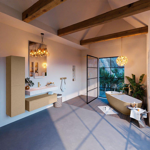 Met zijn strakke lijnen en moderne uitstraling is de MONDIAZ ALAN - DLUX badkamermeubelset een stijlvolle toevoeging aan elke badkamer. De Oro afwerking geeft een warme en luxe uitstraling, terwijl de wasbak in het midden zorgt voor een symmetrisch en evenwichtig design. Dit meubelstuk combineert functionaliteit met esthetiek op een unieke en stijlvolle manier.
