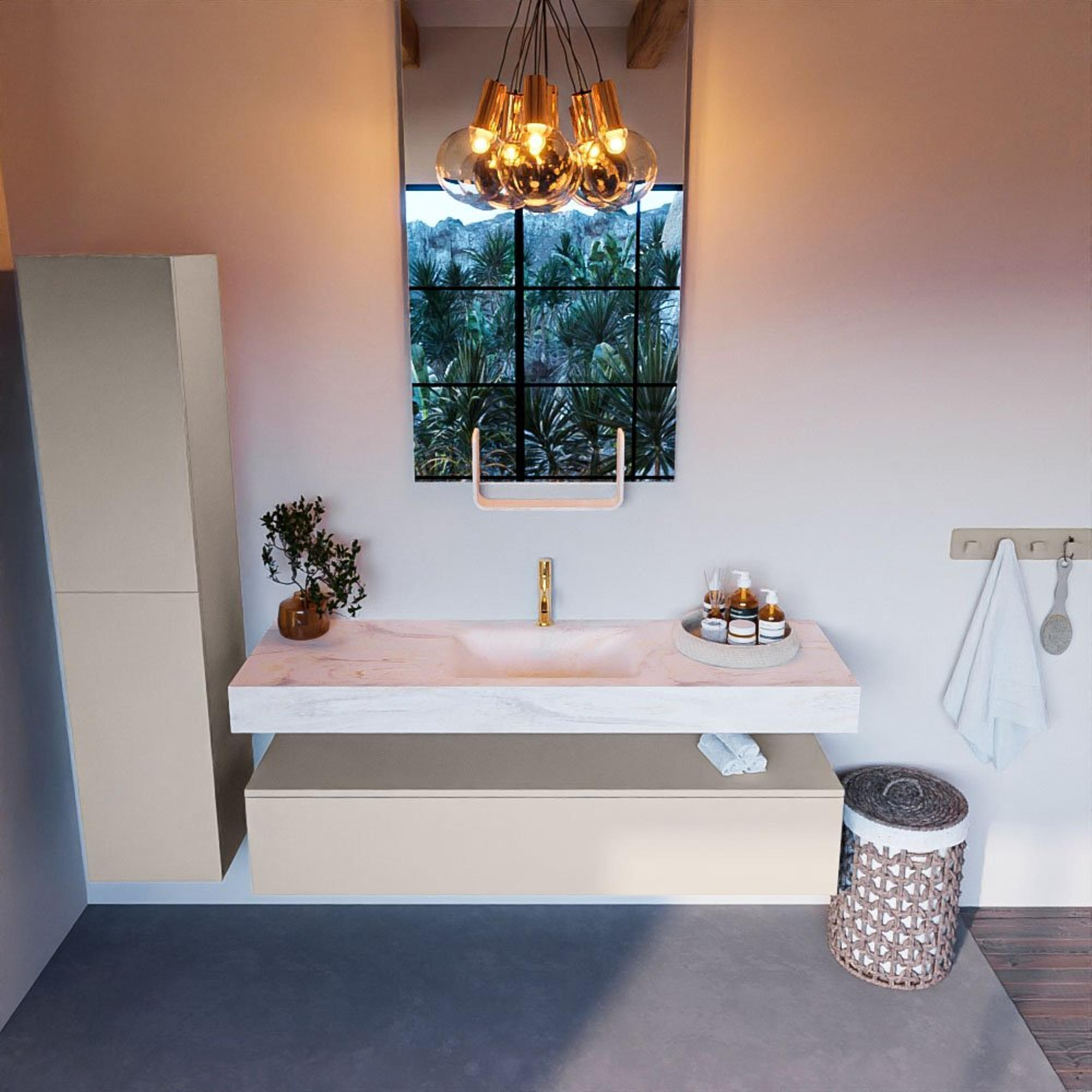 Met zijn strakke lijnen en moderne uitstraling is dit badkamermeubelset een ware eyecatcher in elke badkamer. De Linen afwerking geeft een warme en luxe uitstraling, terwijl de vrijhangende wastafel zorgt voor een ruimtelijk effect. Dit meubelstuk combineert functionaliteit met design op een verfijnde manier, waardoor het de perfecte aanvulling is voor een eigentijdse badkamer.