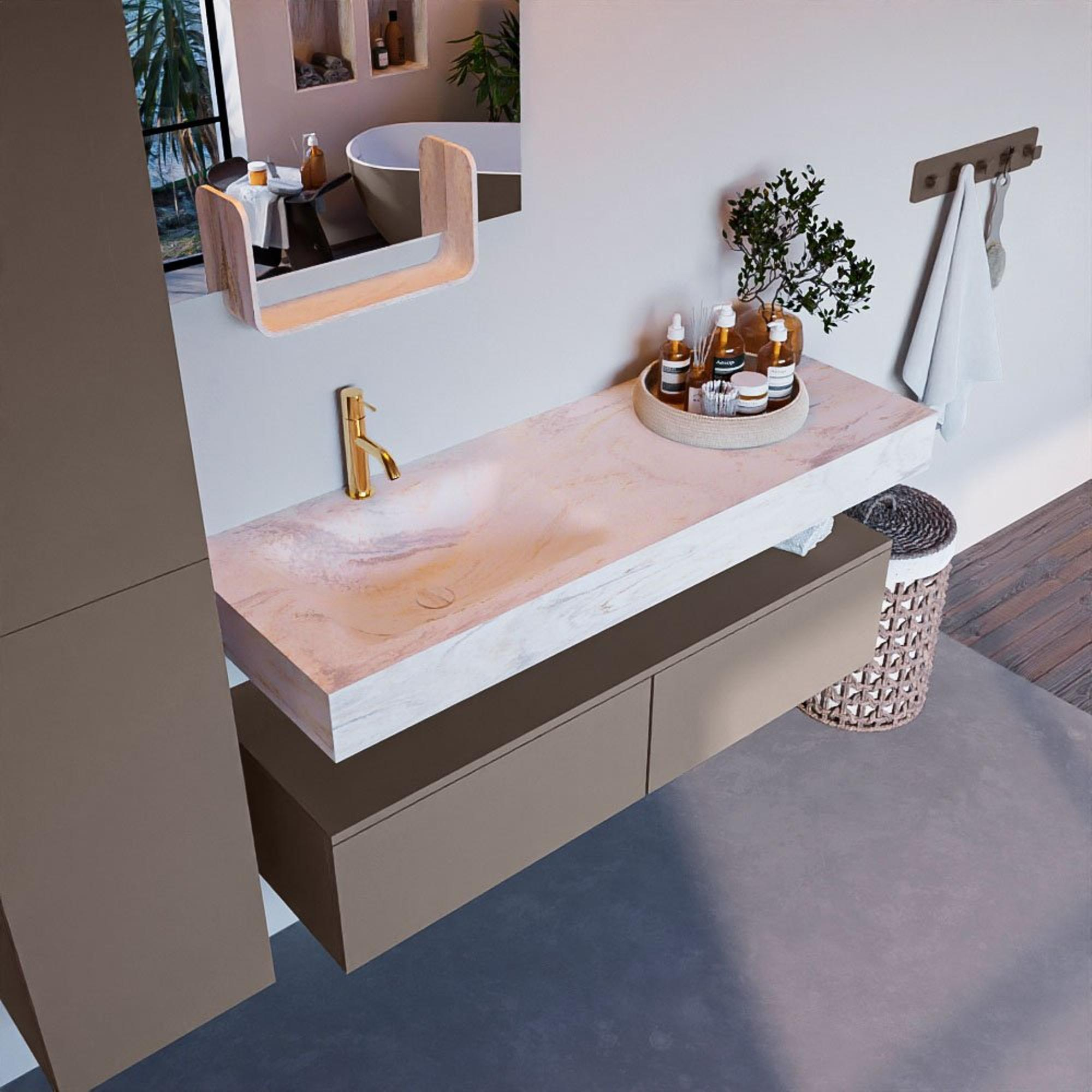 Dit badkamermeubelset is niet alleen mooi, maar ook uiterst functioneel. Met een breedte van 130cm biedt het voldoende ruimte voor dagelijks gebruik. De onderkast zorgt voor extra opbergruimte zonder in te leveren op stijl. De vrijhangende wastafel maakt schoonmaken eenvoudig en efficiënt, terwijl de 2 lades georganiseerde opslag mogelijk maken.