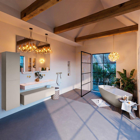 De MONDIAZ ALAN - DLUX Badkamermeubelset is met zijn Linen afwerking en vrijhangende wastafel een stijlvolle toevoeging aan elke badkamer. De subtiele kleur en strakke lijnen zorgen voor een tijdloze uitstraling die moeiteloos past bij verschillende interieurstijlen. De 1 lade biedt handige opbergruimte voor al jouw badkamerspullen, terwijl de 2 wasbakken zorgen voor extra comfort en functionaliteit.