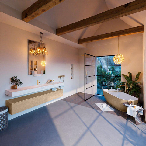 De MONDIAZ ALAN - DLUX Badkamermeubelset is een prachtige toevoeging aan elke badkamer. Met zijn elegante ontwerp en hoogwaardige afwerking straalt dit badkamermeubel luxe en stijl uit. Met een lengte van 200cm biedt het voldoende opbergruimte en functionaliteit, terwijl het toch een luchtige en ruimtelijke uitstraling behoudt. De onderkast in de kleur Oro, met 2 lades en een vrijhangende wastafel met de wasbak in het midden, creëert een eigentijdse en verfijnde sfeer in de badkamer. Het kraangat in Opalo voegt een subtiel vleugje moderniteit toe aan het geheel, waardoor dit meubelstuk een blikvanger wordt in elke badkamer.