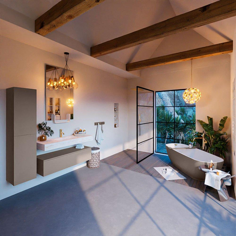 Dit badkamermeubelset onderscheidt zich door zijn stijlvolle ontwerp en verfijnde afwerking. De Smoke kleur geeft een warme en luxe uitstraling aan de badkamer. De vrijhangende wastafel en de strakke lijnen van de onderkast zorgen voor een eigentijdse look die perfect past bij een modern interieur.