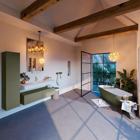 Dit badkamermeubel onderscheidt zich door zijn prachtige ontwerp en aandacht voor detail. De Army kleur geeft een warme en luxe uitstraling aan de badkamer. De vrijhangende wastafel zorgt voor een ruimtelijk gevoel en creëert een moderne sfeer. De 2 lades bieden niet alleen opbergruimte, maar dragen ook bij aan de stijlvolle uitstraling van het meubel.