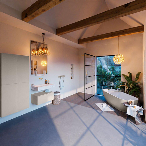 Dit badkamermeubelset onderscheidt zich door zijn stijlvolle ontwerp en Linen afwerking. De strakke lijnen en subtiele details zorgen voor een tijdloze uitstraling die moeiteloos past bij verschillende badkamerstijlen. De vrijhangende wastafel en de middengeplaatste wasbak creëren een eigentijdse look die elke badkamer naar een hoger niveau tilt.