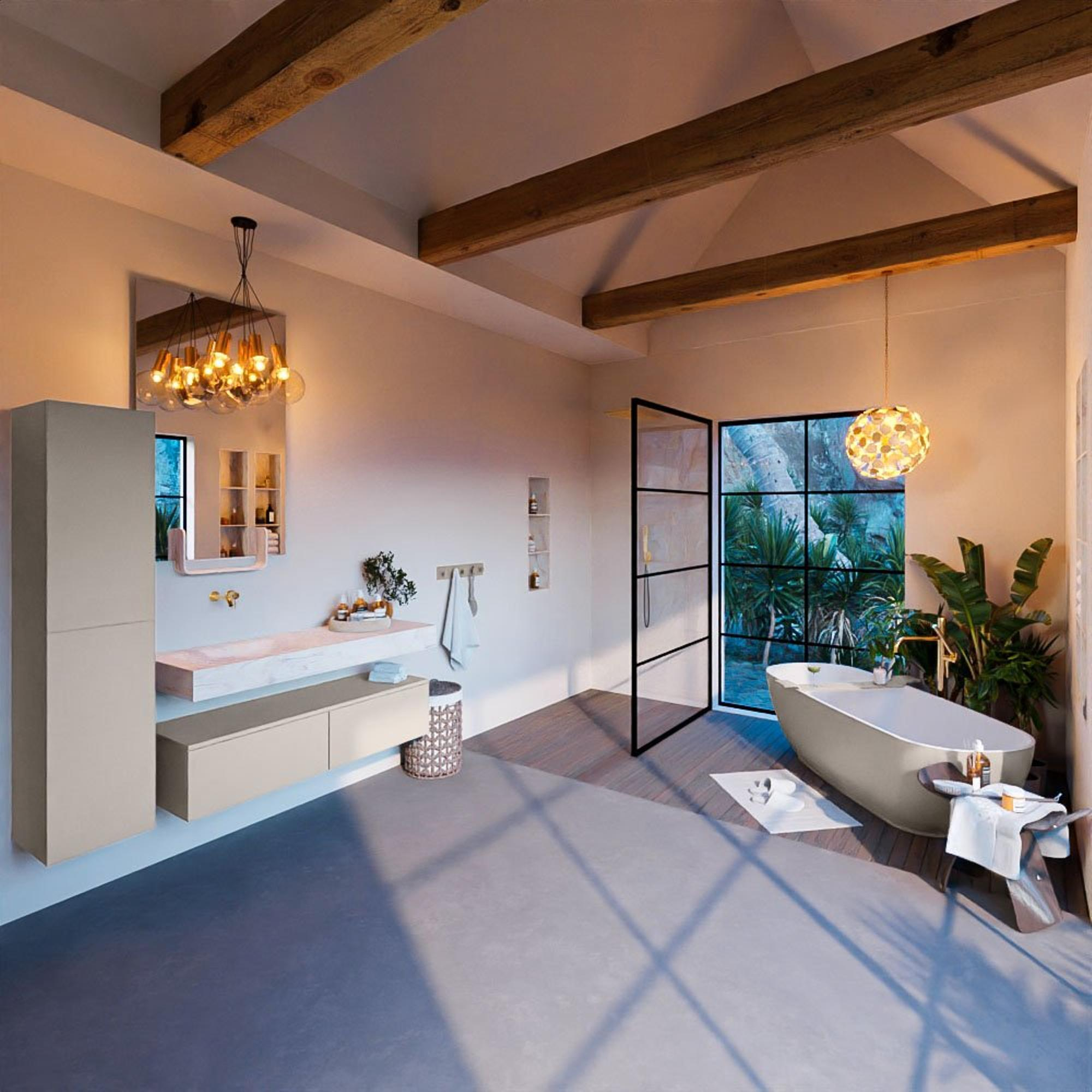 De Ostra designelementen geven dit badkamermeubelset een eigentijdse uitstraling die perfect past bij een moderne inrichting. De strakke vormen en minimalistische details zorgen voor een tijdloos design dat moeiteloos in verschillende interieurstijlen past. Dit meubelstuk is de ideale keuze voor wie op zoek is naar een eigentijdse en verfijnde badkamerinrichting.