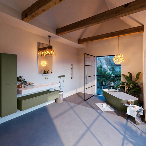 Dit MONDIAZ ALAN - DLUX badkamermeubelset heeft een eigentijdse uitstraling die perfect past in elke moderne badkamer. De vrijhangende wastafel en de strakke lijnen van de onderkast creëren een minimalistisch en chic gevoel. De Army kleur voegt een vleugje elegantie toe, terwijl de wasbak rechts zorgt voor een slimme indeling van de ruimte.