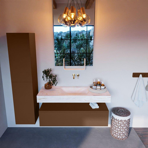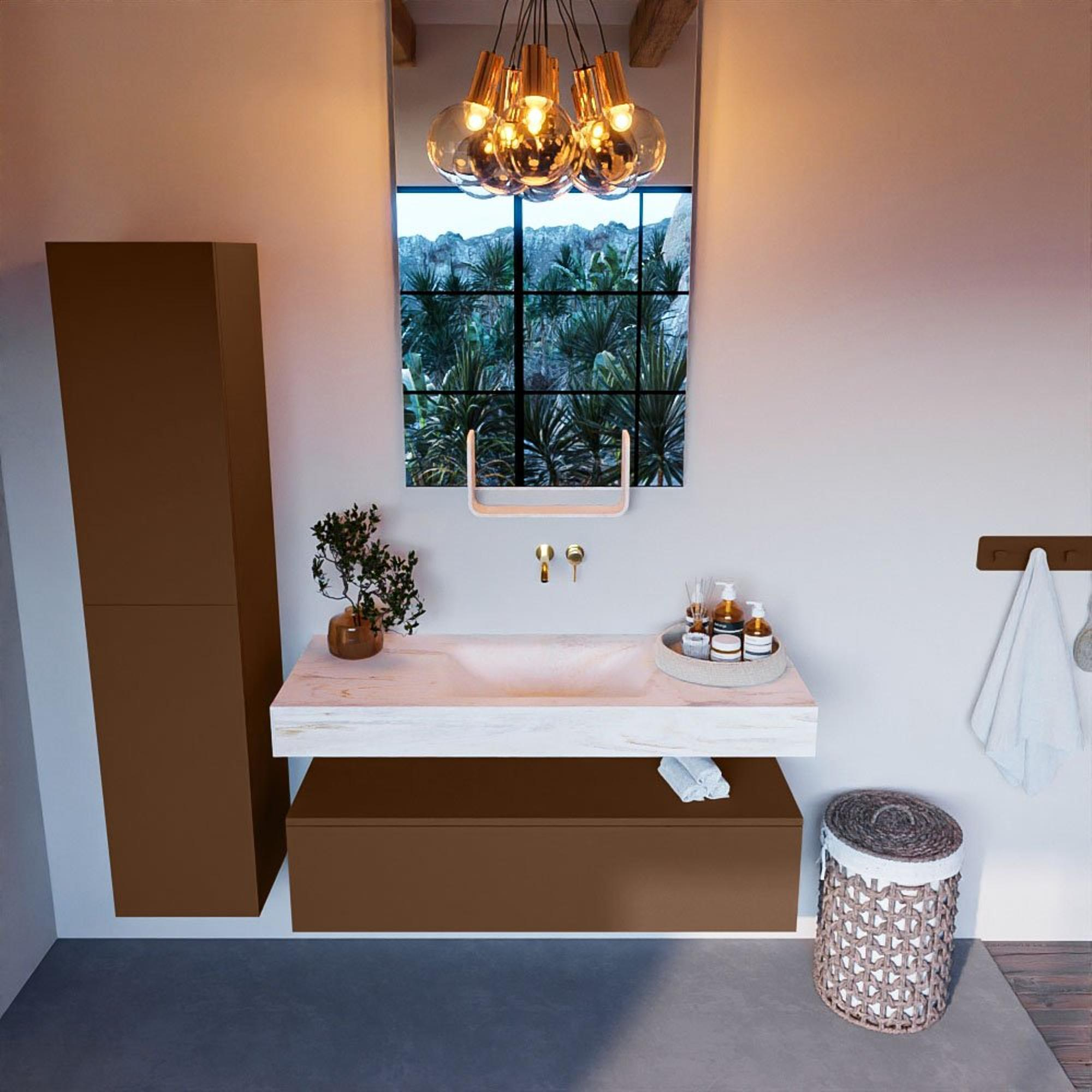 Dit badkamermeubelset straalt stijl en elegantie uit. De combinatie van de Rust-kleurige onderkast en de vrijhangende wastafel met de wasbak in het midden creëert een verfijnde en moderne uitstraling. Het design is tijdloos en past perfect bij diverse badkamerstijlen, van klassiek tot eigentijds.