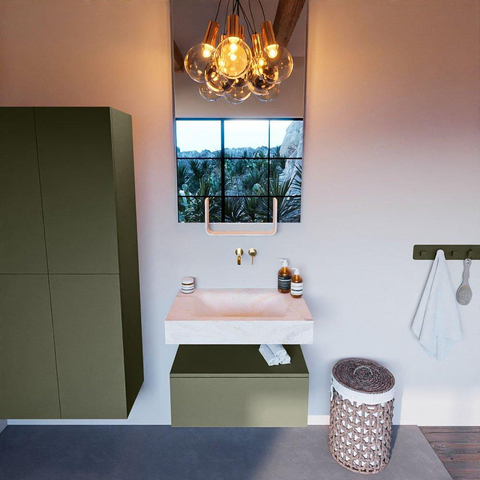 De MONDIAZ ALAN - DLUX Badkamermeubelset straalt stijl en elegantie uit. Met zijn onderkast van 70cm, 1 lade en vrijhangende wastafel met wasbak in het midden, is dit meubel perfect voor diegenen die op zoek zijn naar een eigentijdse en chique uitstraling in hun badkamer. De Army kleur voegt een vleugje warmte toe, terwijl de strakke lijnen zorgen voor een tijdloos design dat indruk maakt.