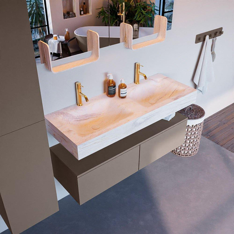 De MONDIAZ ALAN - DLUX badkamermeubelset is niet alleen stijlvol, maar ook uiterst functioneel. De 2 lades bieden voldoende ruimte voor het opbergen van handdoeken, toiletartikelen en andere benodigdheden. De vrijhangende wastafel met 2 kraangaten maakt het mogelijk om comfortabel te genieten van je dagelijkse routines, terwijl de dubbele wasbakken zorgen voor extra gemak en efficiëntie in de badkamer.