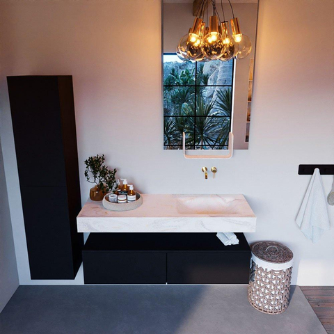 Dit badkamermeubel straalt luxe uit in elk detail. Met 2 lades biedt het niet alleen voldoende opbergruimte, maar ook een gevoel van exclusiviteit. De hoogwaardige materialen en het Ostra design maken dit meubelstuk een elegante en luxe keuze voor jouw badkamer.