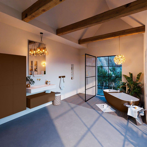 De MONDIAZ ALAN - DLUX badkamermeubelset straalt schoonheid en stijl uit. Het rustieke design in combinatie met de vrijhangende wastafel creëert een harmonieus geheel dat de badkamer transformeert tot een luxe oase van ontspanning.