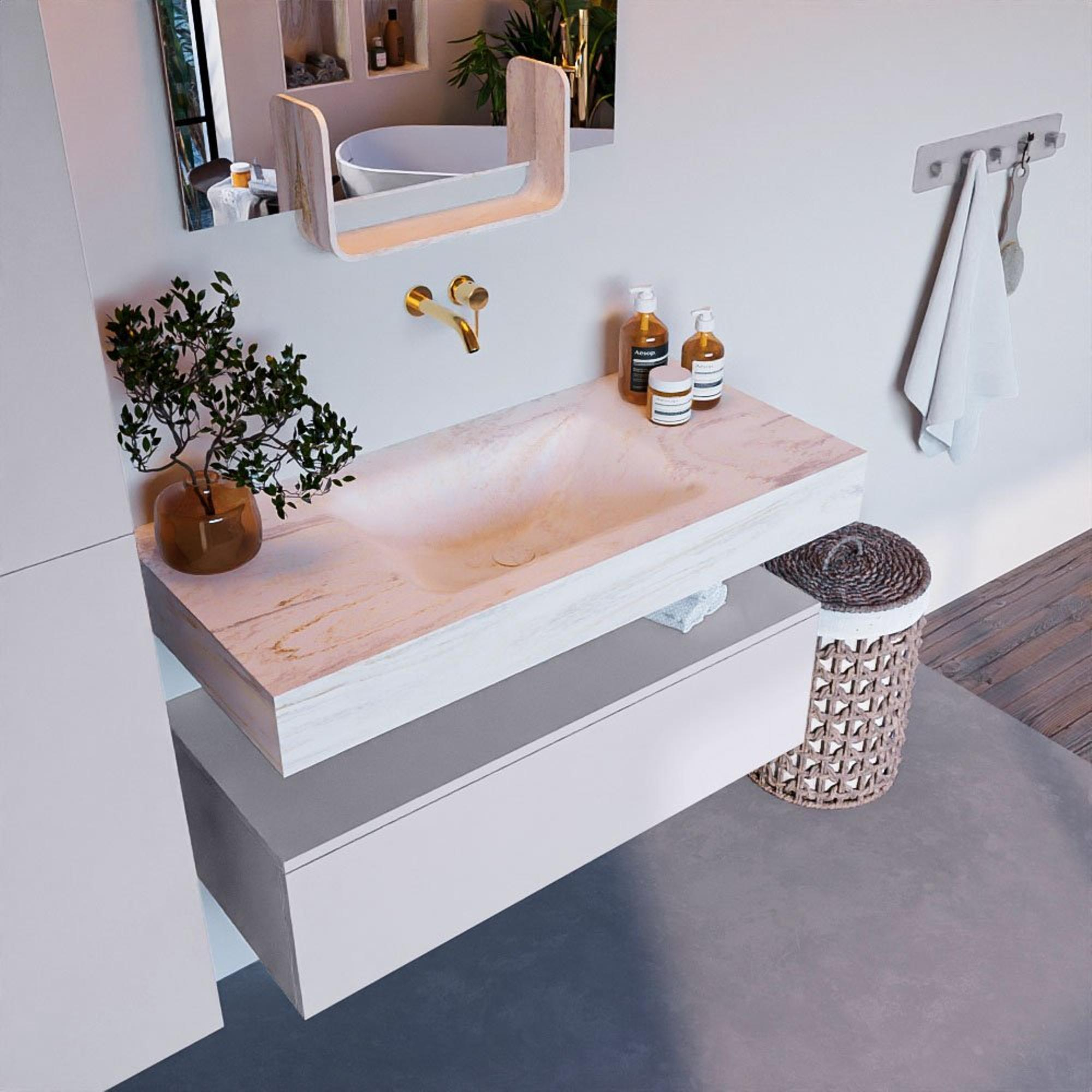 Naast het esthetische aspect is dit badkamermeubel ook zeer functioneel. Met 1 lade en voldoende opbergruimte biedt het voldoende plaats voor al jouw badkamerspullen. De wasbak in het midden zorgt voor een handige indeling en maakt het gebruiksgemak compleet. Dit meubelstuk combineert dus stijl met functionaliteit op een perfecte manier.