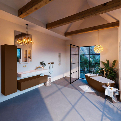 De MONDIAZ ALAN - DLUX Badkamermeubelset straalt een moderne en eigentijdse sfeer uit. Het ontwerp is minimalistisch en strak, waardoor het perfect past in hedendaagse badkamers. De rustieke kleur en de vrijhangende wastafel creëren een gevoel van ruimte en lichtheid in de kamer. De wasbak aan de linkerkant zorgt voor een slimme indeling en maakt efficiënt gebruik van de beschikbare ruimte.