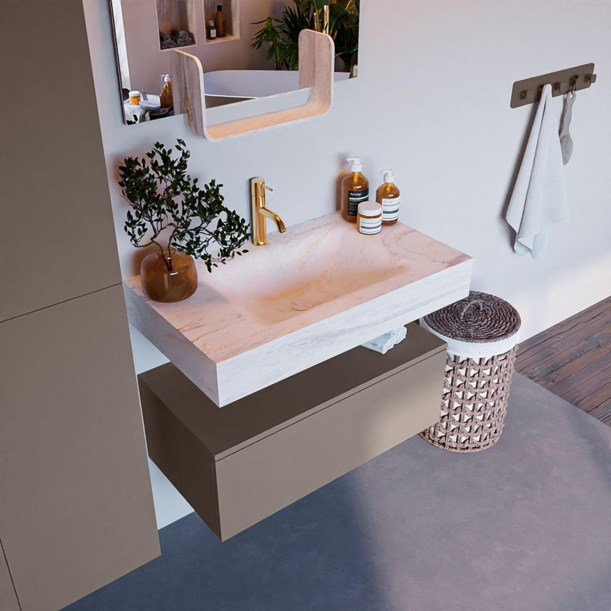 De MONDIAZ ALAN - DLUX Badkamermeubelset straalt stijl en klasse uit. De Smoke kleur geeft een moderne en warme uitstraling aan de badkamer. De vrijhangende wastafel met de wasbak in het midden zorgt voor een symmetrisch en evenwichtig ontwerp. De 1 lade biedt voldoende opbergruimte voor al je badkamerbenodigdheden, terwijl het kraangat zorgt voor gemakkelijke installatie van een elegante kraan.