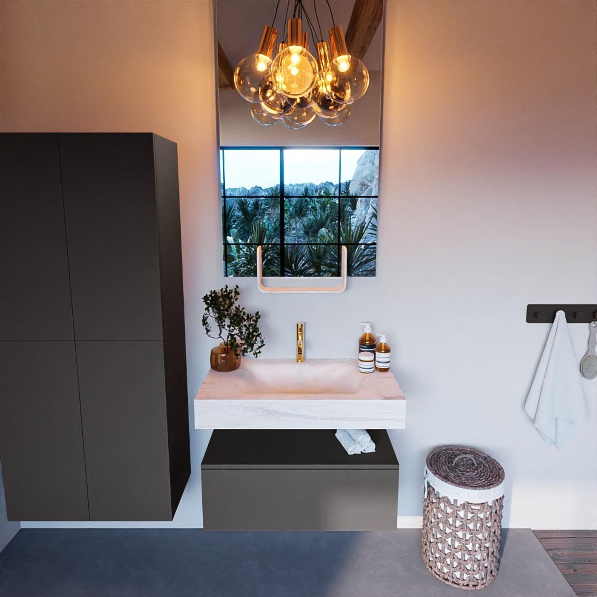 Met een handige lade en een kraangat biedt dit badkamermeubelset niet alleen stijl, maar ook functionaliteit. De lade zorgt voor opbergruimte voor al je badkamerbenodigdheden, terwijl het kraangat perfect is afgestemd op dagelijks gebruik. Dit meubelstuk combineert design en functionaliteit op een slimme manier.