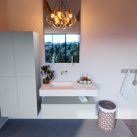 Dit badkamermeubelset straalt stijl en klasse uit. De Clay kleur geeft een warme en uitnodigende uitstraling aan de ruimte. De vrijhangende wastafel en de wasbak links zorgen voor een eigentijdse en ruimtelijke look. De 1 lade biedt voldoende opbergruimte voor al jouw badkamerspullen, terwijl de strakke lijnen en moderne vormgeving een tijdloze elegantie toevoegen aan de badkamer.