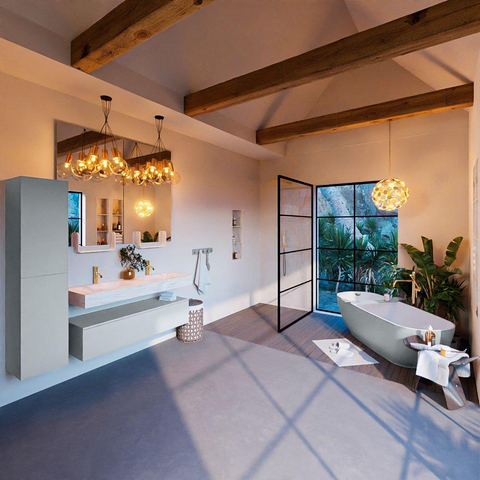 De MONDIAZ ALAN - DLUX Badkamermeubelset valt op door zijn stijlvolle uitstraling. Het Clay-kleurige onderkastje geeft een warme en moderne touch aan de badkamer. De vrijhangende wastafel met 2 wasbakken zorgt voor een luxueuze uitstraling, terwijl de 1 lade voldoende opbergruimte biedt voor al jouw badkamerspullen.