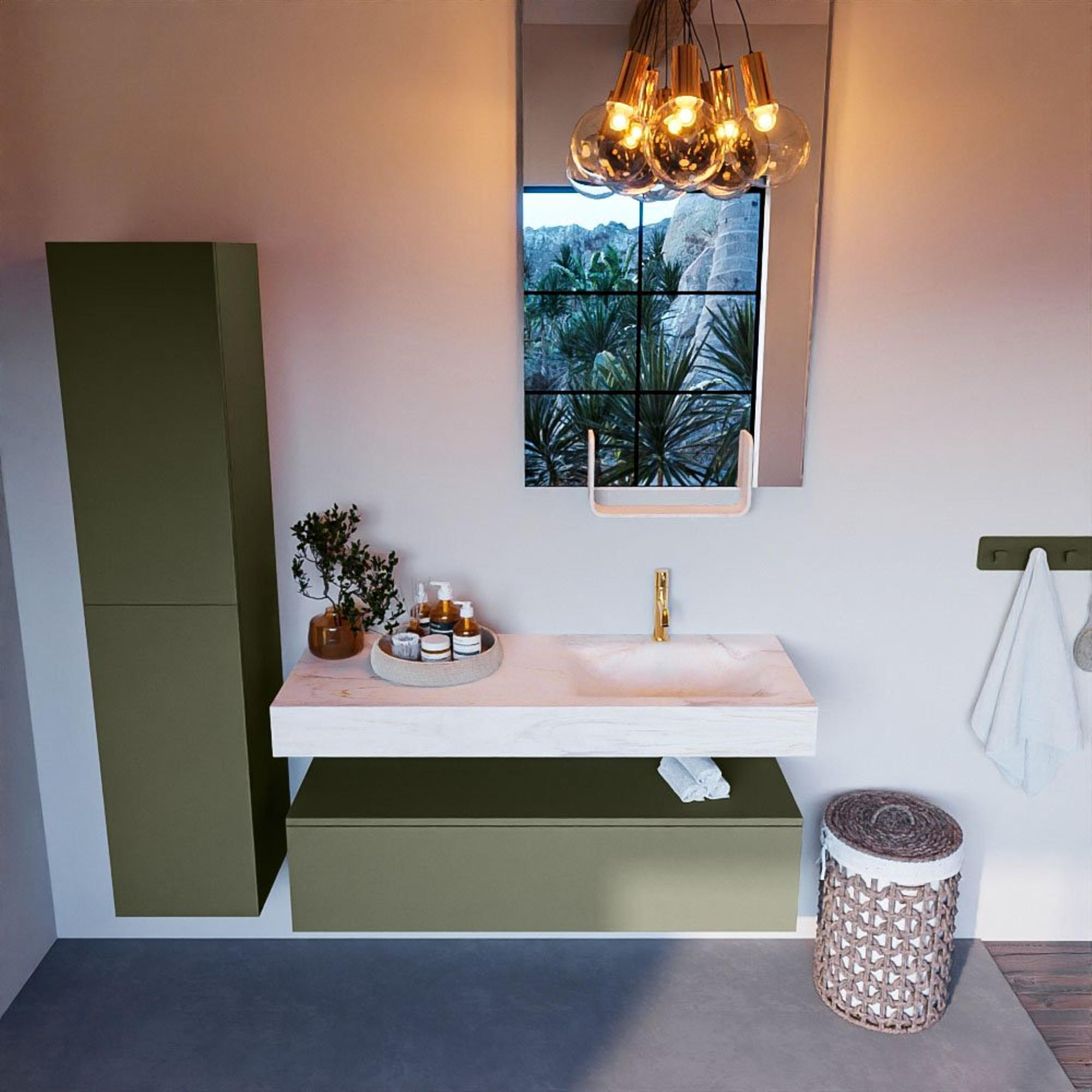 De MONDIAZ ALAN - DLUX Badkamermeubelset straalt luxe uit in elke badkamer. Het ontwerp is tot in de kleinste details doordacht, met hoogwaardige materialen en afwerkingen die een gevoel van elegantie en verfijning toevoegen. De combinatie van de Army kleur en de vrijhangende wastafel creëert een gevoel van ruimte en comfort, terwijl de 1 lade voldoende opbergruimte biedt voor al uw badkamerspullen.