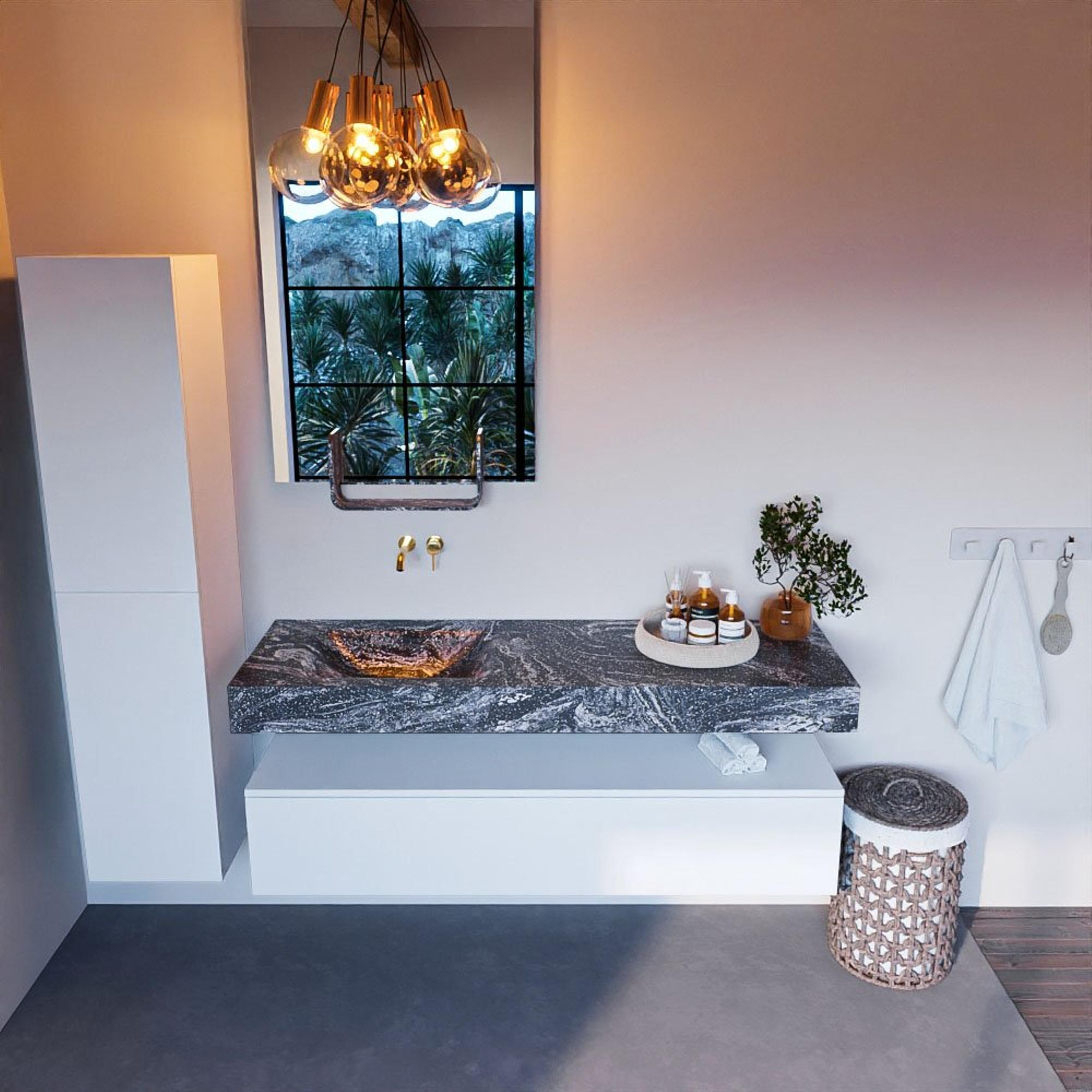 De MONDIAZ ALAN - DLUX Badkamermeubelset is een ware blikvanger voor elke badkamer. Met een lengte van 150cm biedt deze set een ruime onderkast met een elegante Talc afwerking. De set beschikt over 1 lade voor het opbergen van al je badkamerbenodigdheden. De vrijhangende wastafel met de wasbak aan de linkerkant straalt moderniteit en stijl uit. Met 0 kraangaten en de Lava kleur, past deze badkamermeubelset perfect in diverse interieurstijlen.