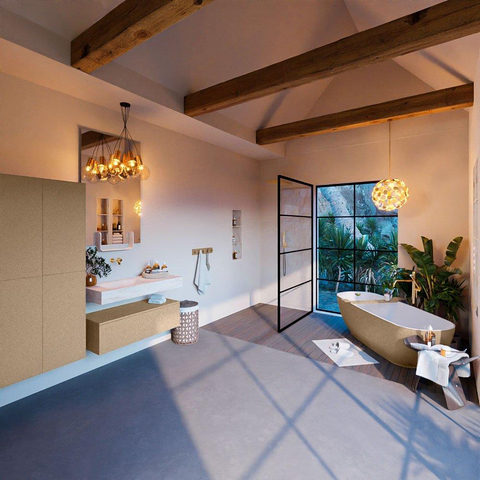 De MONDIAZ ALAN - DLUX Badkamermeubelset straalt een onmiskenbare elegantie uit. De combinatie van de Oro kleur en de vrijhangende wastafel creëert een luxueuze sfeer in de badkamer. De wasbak aan de linkerkant zorgt voor een symmetrisch en evenwichtig ontwerp dat de ruimte verfraait.