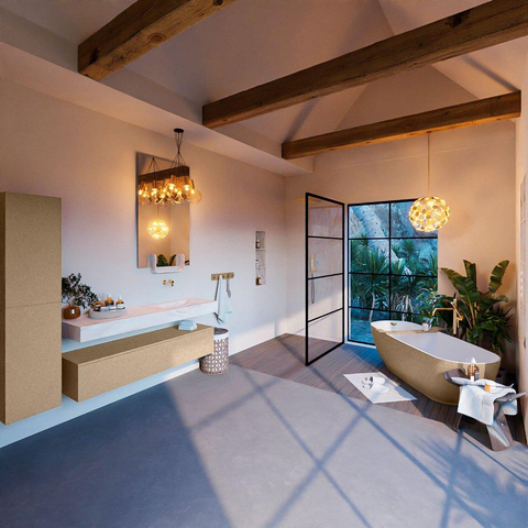 De MONDIAZ ALAN - DLUX Badkamermeubelset straalt stijl en elegantie uit. Het ontwerp in de kleur Oro geeft een warme en luxe uitstraling aan de badkamer. De vrijhangende wastafel en de subtiel geplaatste wasbak aan de rechterkant zorgen voor een eigentijdse look die perfect past bij moderne interieurs.