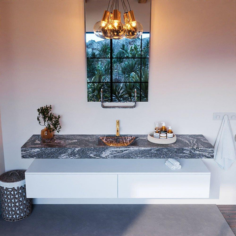 Naast zijn esthetische waarde is dit badkamermeubelset ook zeer functioneel. Met 2 ruime lades biedt het voldoende opbergruimte voor al je badkamerspullen, van handdoeken tot verzorgingsproducten. De vrijhangende wastafel met de wasbak in het midden zorgt voor een ergonomische en praktische indeling, terwijl het kraangat gemakkelijk toegankelijk is voor dagelijks gebruik.