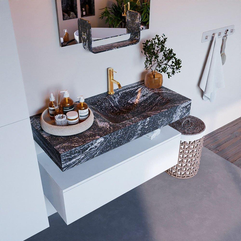 Naast zijn esthetische waarde is de MONDIAZ ALAN - DLUX Badkamermeubelset ook zeer functioneel. Met een onderkast van 100cm en een handige lade biedt dit meubel voldoende opbergruimte voor al je badkamerbenodigdheden. Het kraangat aan de rechterkant zorgt voor een eenvoudige installatie van je favoriete kraan, terwijl de vrijhangende wastafel een gevoel van ruimte en lichtheid creëert in je badkamer.