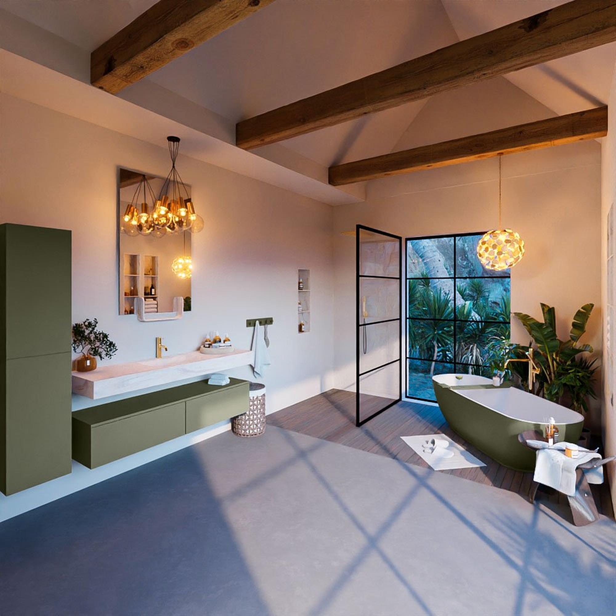 Met zijn strakke lijnen en Army kleur is dit badkamermeubelset een stijlvolle toevoeging aan elke badkamer. De vrijhangende wastafel en de middengeplaatste wasbak zorgen voor een eigentijdse uitstraling die moeiteloos past bij diverse interieurstijlen. De Ostra afwerking geeft het geheel een luxe gevoel, waardoor dit meubelset een blikvanger wordt in de ruimte.