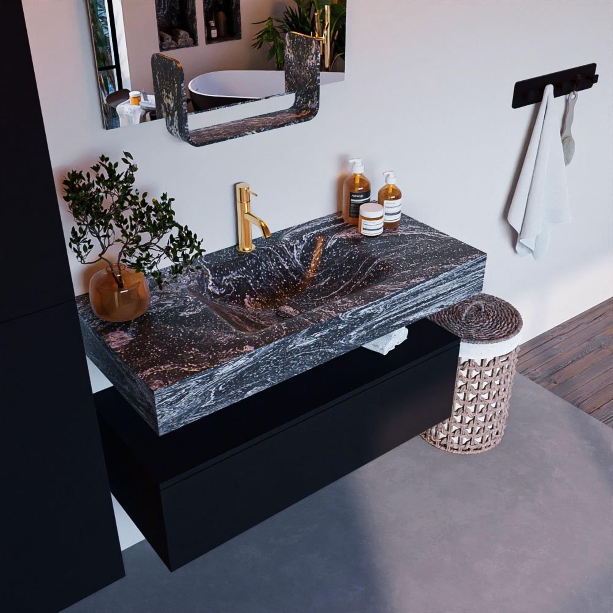 De MONDIAZ ALAN - DLUX Badkamermeubelset is een prachtige toevoeging aan elke badkamer. Met zijn moderne design en hoogwaardige afwerking brengt dit badkamermeubel een vleugje elegantie en stijl naar jouw ruimte. Het 100cm lange onderkast biedt voldoende opbergruimte, terwijl de vrijhangende wastafel en de midden geplaatste wasbak zorgen voor een strakke en eigentijdse uitstraling. Met één kraangat en de Lava afwerking is dit meubel niet alleen functioneel maar ook een ware eyecatcher.