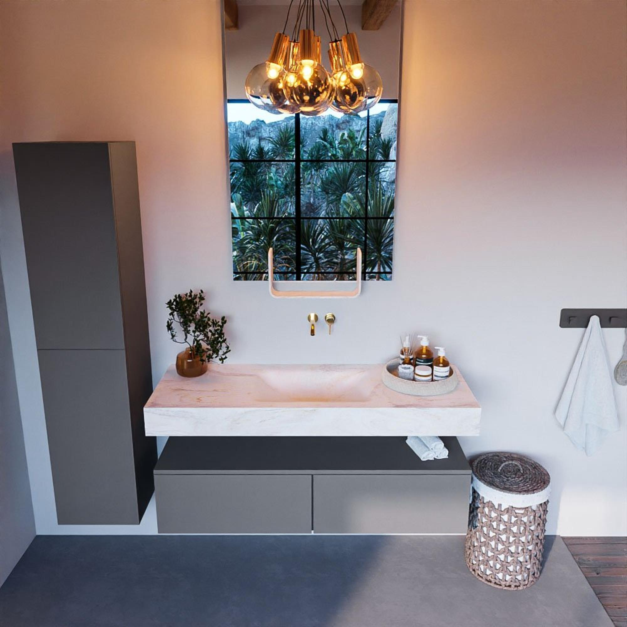 Naast zijn esthetische waarde is dit badkamermeubel ook zeer functioneel. De wasbak in het midden zorgt voor een handige indeling en maakt het gemakkelijk om je dagelijkse routine uit te voeren. De vrijhangende wastafel creëert een gevoel van ruimte en lichtheid, waardoor de badkamer er groter uitziet. Met 0 kraangaten heeft dit meubel een strakke en minimalistische uitstraling die perfect past bij een eigentijdse inrichting.