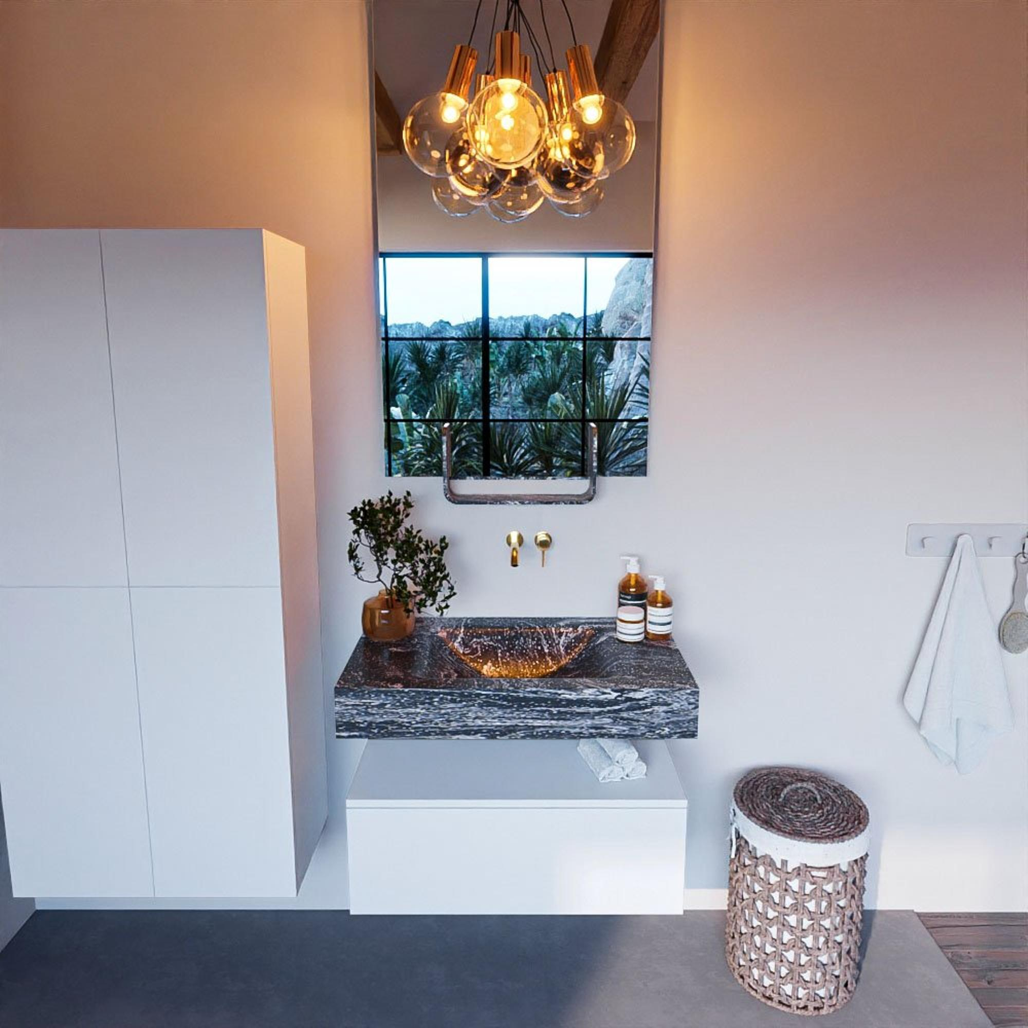 Dit badkamermeubel onderscheidt zich door zijn stijlvolle ontwerp en verfijnde uitstraling. De combinatie van de Talc kleur en de Lava afwerking zorgt voor een tijdloze elegantie die moeiteloos past bij verschillende badkamerstijlen. De vrijhangende wastafel en de subtiele lade voegen een vleugje luxe toe aan de ruimte, terwijl de wasbak in het midden zorgt voor een evenwichtige en harmonieuze uitstraling.