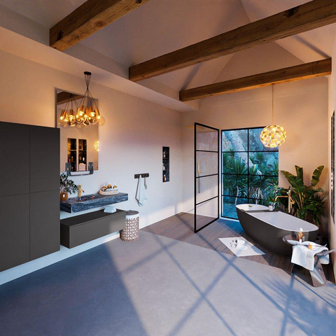 Naast zijn esthetische waarde is dit badkamermeubel ook zeer functioneel. De onderkast met 1 lade biedt voldoende ruimte om al uw badkamerbenodigdheden georganiseerd te houden. De vrijhangende wastafel met de wasbak links zorgt voor een efficiënt gebruik van de ruimte, terwijl het kraangat en de lava-afwerking een vleugje luxe toevoegen.